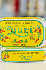 Unit price / perNuri Spiced Sardines in Olive Oil contains olive oil, cucumber, chili, carrot, salt, cloves, black pepper, and laurel. The origin of the Arabic word, Nuri is synonymous of shining, carrier of brightness. What more suitable expression to define the peculiarity of this brand.