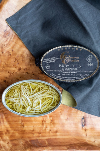 These tiny eels are harvested by net from the streams of northern Spain. They are then carefully cooked in olive oil to preserve the delicate flavor and texture of the precious baby eels.
