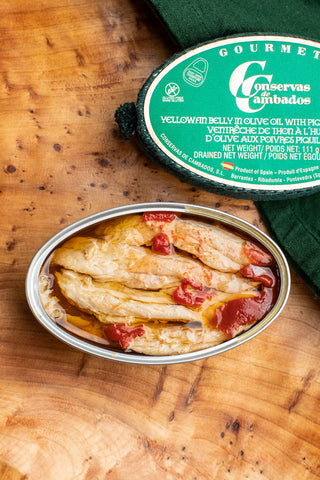Conservas de Cambados Yellowfin Belly in Olive Oil with Piquillo Peppers is a delicious and flavourful gourmet product from Spain. Made from the finest quality yellowfin tuna belly, this fish is carefully cooked and preserved in premium quality olive oil with a touch of piquillo peppers, which adds a sweet and slightly spicy flavor to the fish.