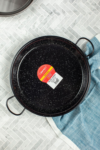 Description: Durable enamel paella pan made of steel and coated with a black and white speckled enamel, so rusting will not be an issue.