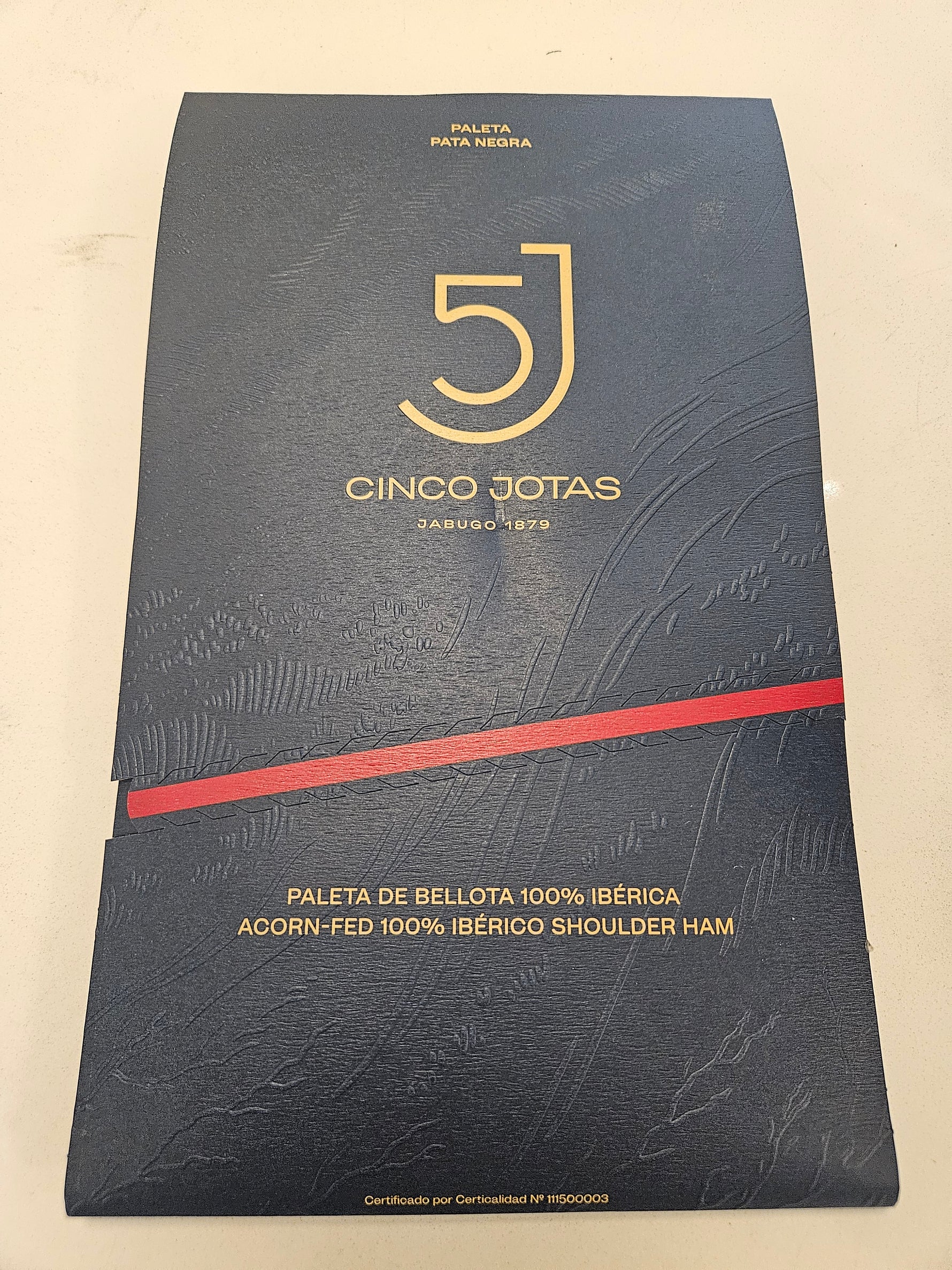 Cinco Jotas is one of the best producers of bellota ham in the World. This is from the shoulder of the free roaming acorn fed pig. Shoulder ham tends to have a more unctuous texture than the hind leg ham, leaving a film of flavour in your mouth that is just incomparable to any other cured meats.