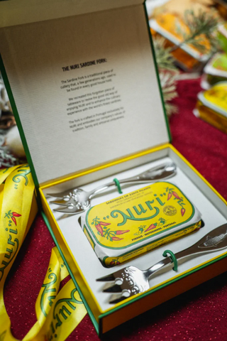 Perfect as a thoughtful gift or a stylish personal indulgence, this pack is as much about ritual as it is about flavour. The fork itself features a long handle and flat tines, perfectly shaped for lifting sardines straight from the tin without breaking them — because these beauties deserve proper respect. With the Nuri logo elegantly stamped into the metal, it's a subtle nod to tradition and craftsmanship.