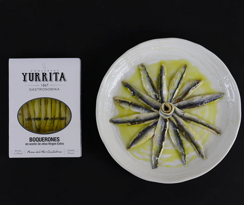 For over 150 years, Yurrita has been perfecting the art of Cantabrian seafood, and their boquerones (white anchovy fillets) in extra virgin olive oil are a shining example of their craft. Hand-selected from the cool waters of the Bay of Biscay, these anchovies are prized for their delicate texture and clean, briny flavour. Unlike their salt-cured cousins, boquerones are gently marinated to preserve their natural freshness and pale ivory colour, then packed in smooth, fruity extra virgin olive oil that enhances their subtle richness.