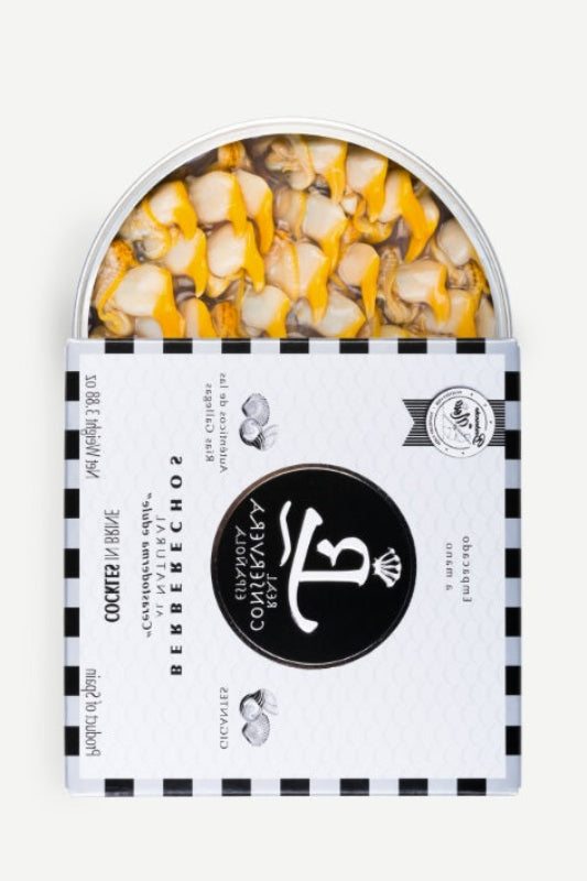 Unit price / perBerberechos al Natural by Real Conservera Española represent one of the most precise and elegant expressions of Galician shellfish preservation. Harvested from the sandy beds of the Rías Gallegas, these cockles are carefully selected in the prized 30–35 count range, where size, tenderness, and intensity of flavour reach an ideal balance.